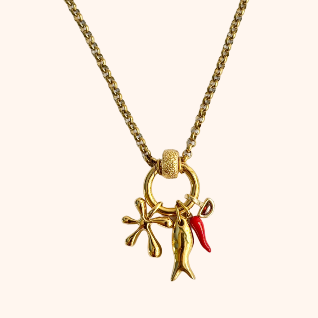 Gold Plated Stainless Steel Chill/ Fish/ Flower/ Maroon Topaz Charm Necklace
