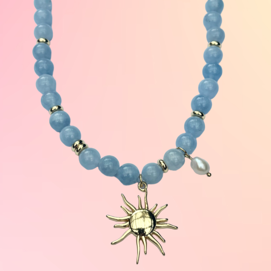 Handmade Natural Gemstone Fresh Water Pearl Beaded Necklace with Sun Pendant